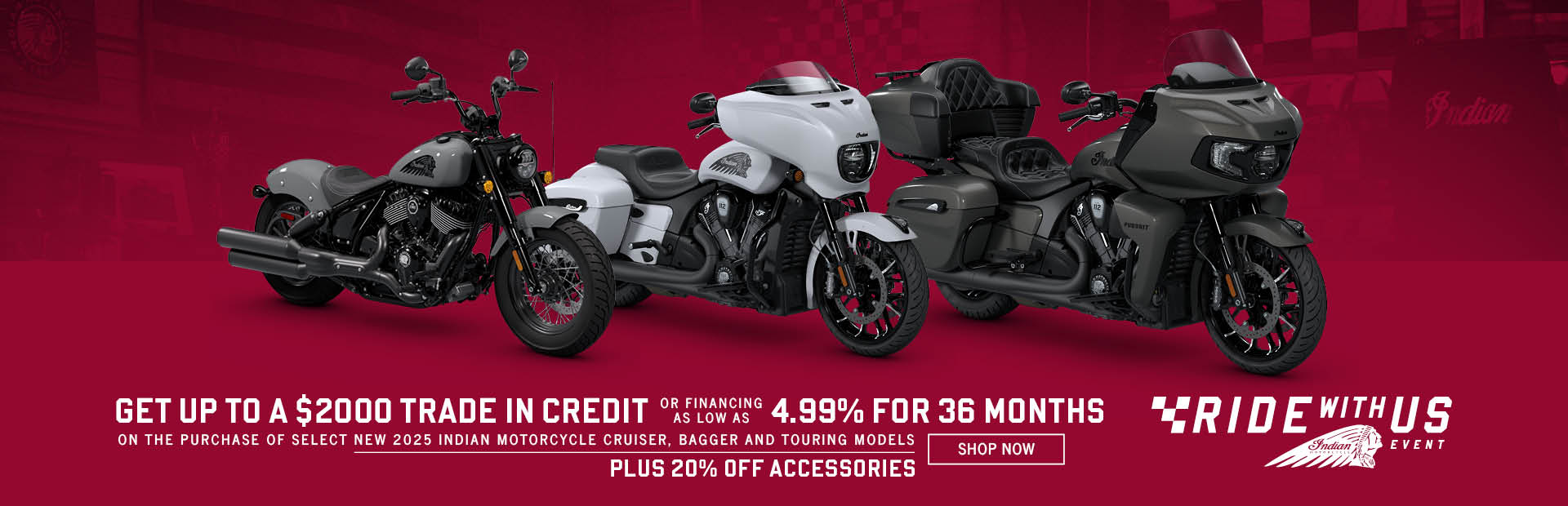 This is a limited time offer which is valid for the purchase of selected qualifying models and is subject to credit approval on qualified purchases financed during this program. Offer may not be combined with certain other offers (specifically trade-in credit), is subject to change and may be extended or terminated without further notice. Offer valid on select new 2025 models (excludes Elites): MY25 Indian Springfield models, MY25 Chieftain models, MY25 Roadmaster models, MY25 PowerPlus family (Chieftain PowerPlus, Roadmaster PowerPlus, Indian Challenger, or Indian Pursuit), or MY25 Chief models (2025 Indian Chief, Chief Bobber, Super Chief and Sport Chief models). Monthly payment and cost of borrowing will vary depending on amount borrowed and down payment/trade. Minimum amount to finance is $5,000. Example: $14,999 financed at 4.99% APR over 36 months = 36 monthly payments of $379; financed amount of $13,499 with 10% down payment, total cost of borrowing of $1,064 and a total obligation of $14,563. An example of monthly payments required on a 36-month term at 4.99% APR is $29.97 per $1,000 financed. Monthly payment examples do not include taxes, title, and other fees. Offer only valid to qualified customers, not all customers will qualify, other offers available, see dealer for details. Excludes all Elite Models. Offer Valid:October 1 - 31, 2025. 2025 Roadmaster and Chieftain Models $2,000 Trade-In Credit This is a limited time offer which consists of $2,000 Trade-In Credit towards the purchase of a new model year 2025 Chieftain, or Roadmaster model. Excludes Elite models. This offer is subject to change and may be extended or terminated without further notice. Offer may not be combined with promotional financing. All rebates paid to dealer and are not redeemable for cash. Offer Valid: October 1 – 31, 2025. 2025 Indian Challenger $1,000 Customer Cash