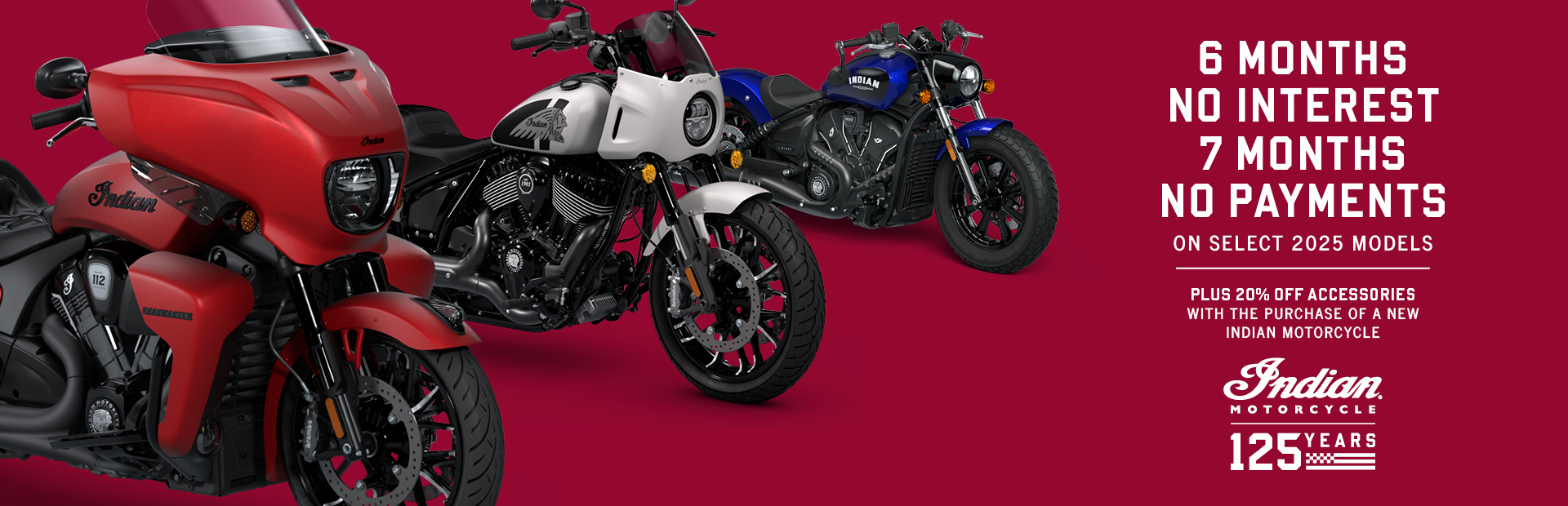 Promotion: 6 months no interest & No Payments for 7 months on Select 2025 Models. Plus, 20% off accessories with the purchase of a new Indian Motorcycle.