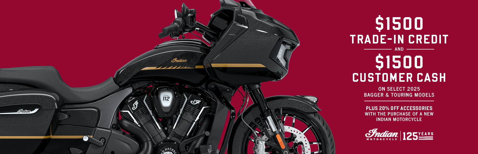 Promotion: Get up to $1500 Customer Cash and $1500 Trade-In Credit on select new 2025 Bagger & Touring Models. Plus, 20% off accessories with the purchase of a new Indian Motorcycle.
