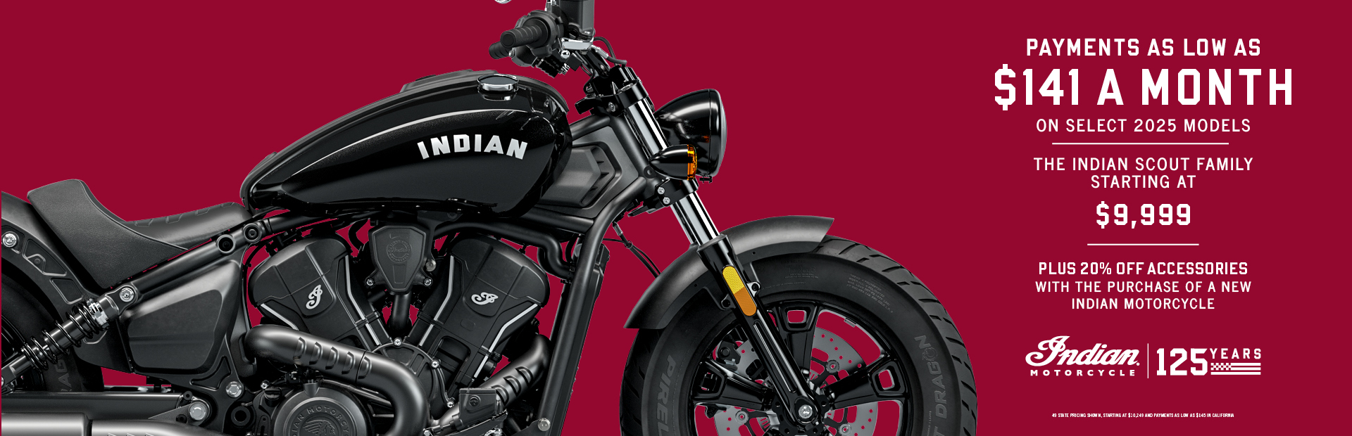 Promotion: Payments as low as $141/Month. Plus, 20% off accessories with the purchase of a new Indian Motorcycle.